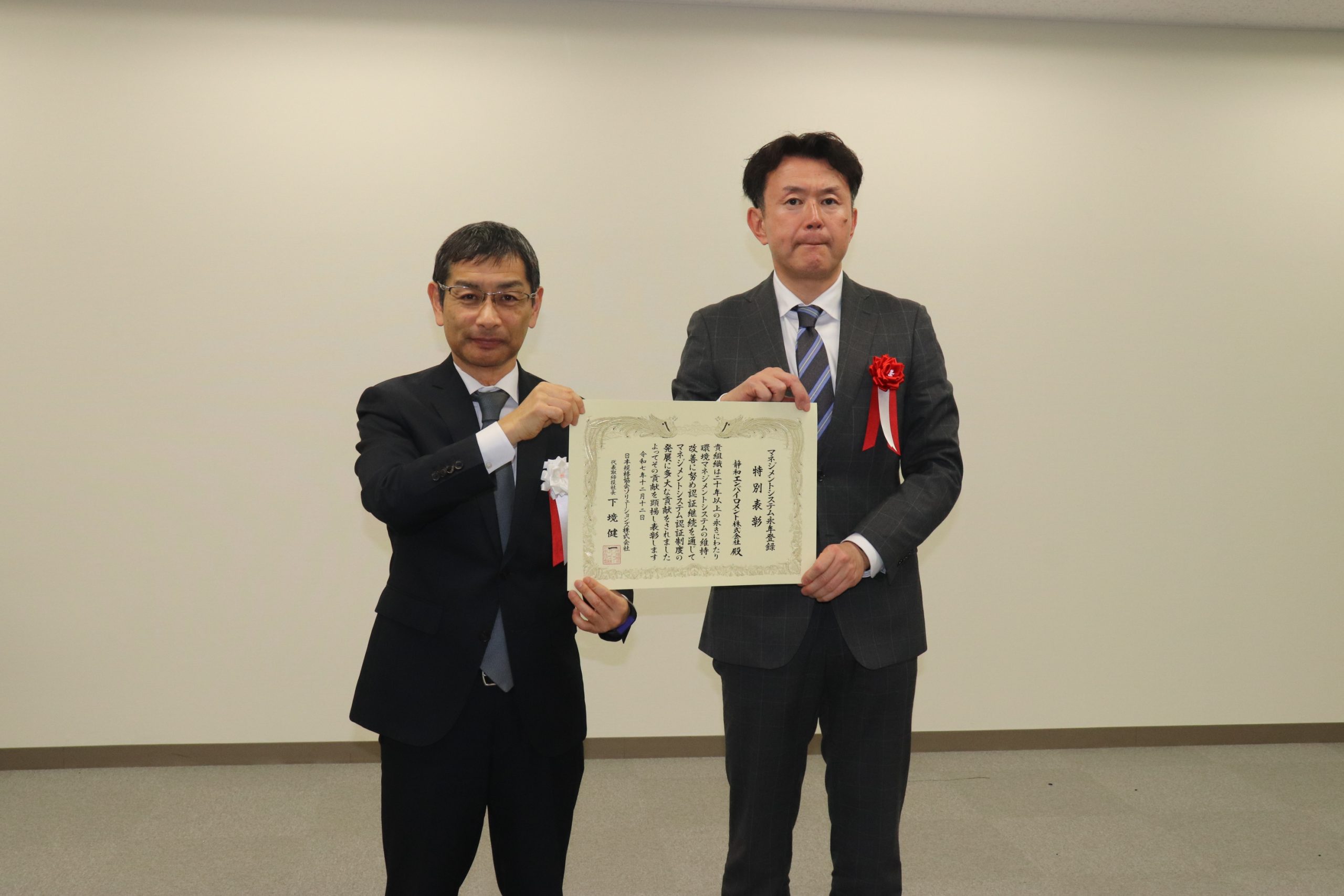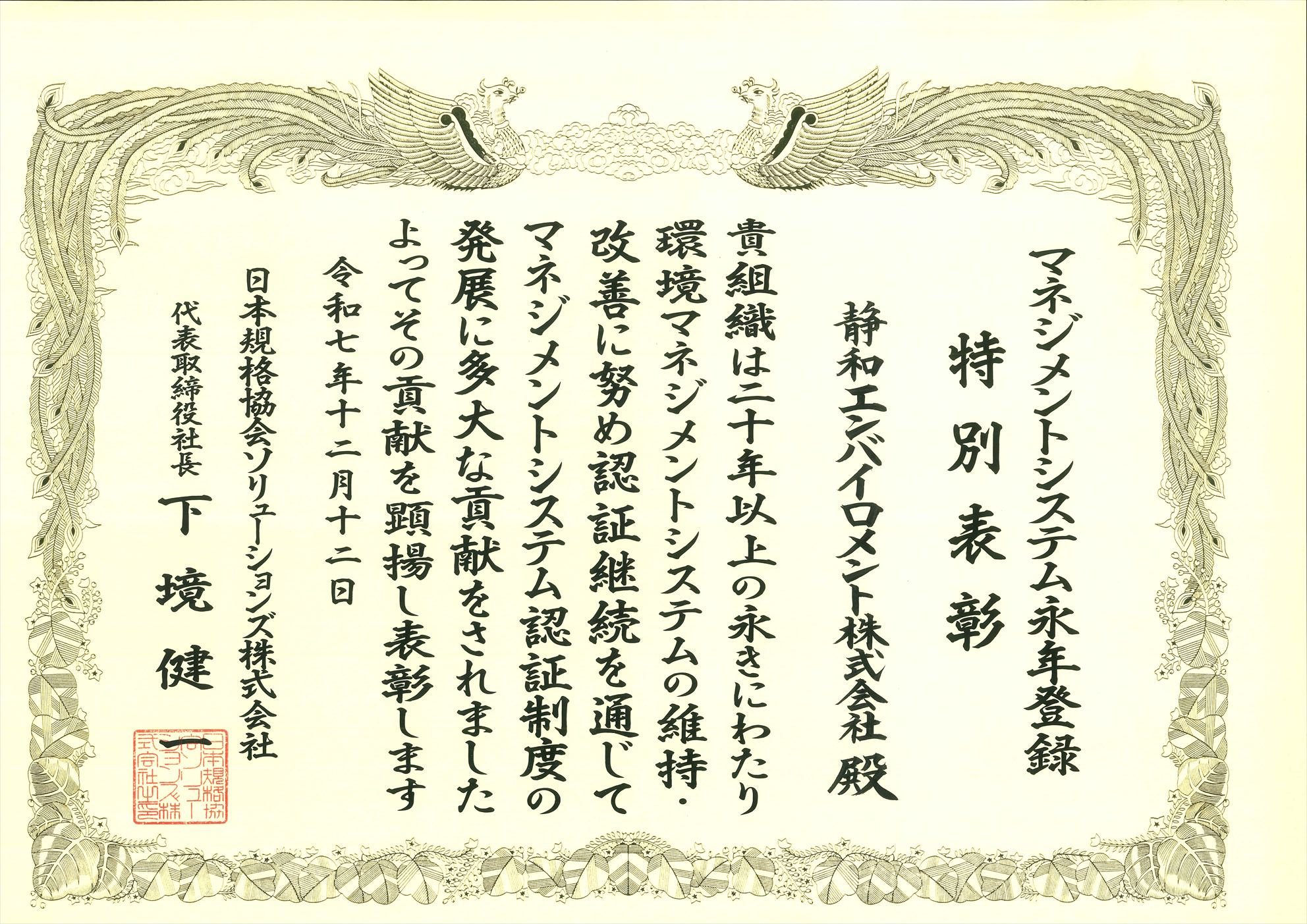 ISO14001の認証を20年にわたり継続し、環境への貢献を果たしてきた功績が認められ、永年登録特別表彰を受賞しました。